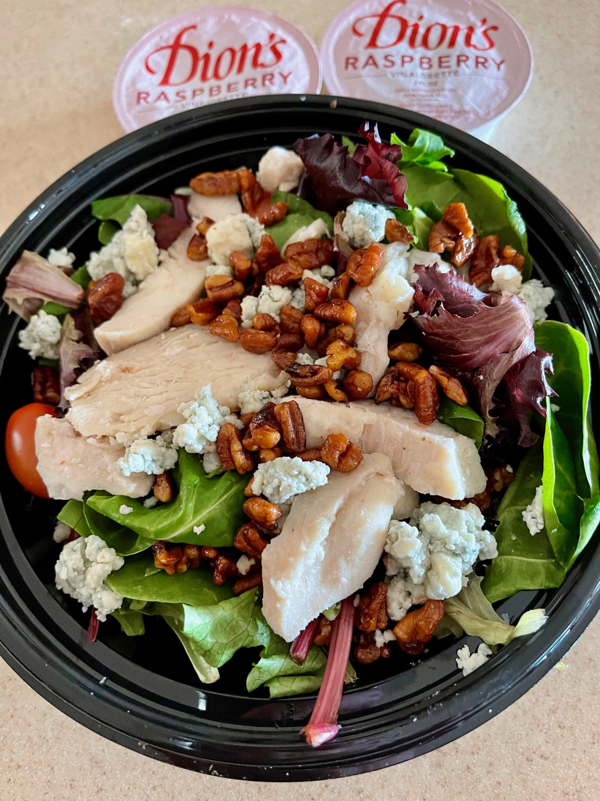 Another excellent salad is the Chicken Pecan Salad (spring mix, chicken, pecans, bleu cheese crumbles, and tomatoes) with a tangy raspberry vinaigrette. Yet another winner is Dion’s Chef Salad (fresh lettuce, ham, Cheddar, sliced egg, bacon, tomatoes, mix (diced cucumbers, red onion and bell peppers) and croutons.