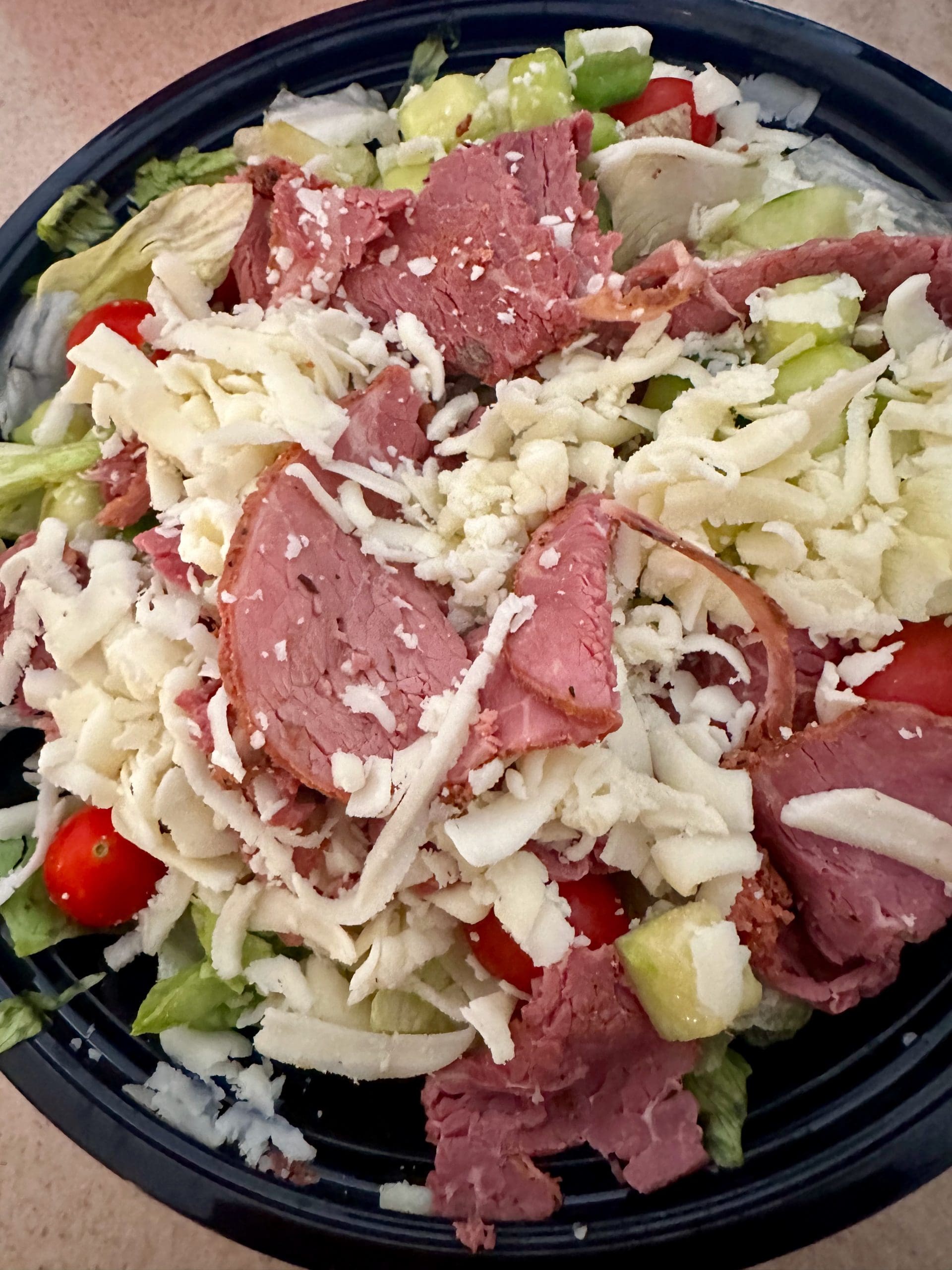 21 August 2024: I have yet to be asked “Would you like some salad with your Green Chile Ranch dressing” but it’s probably coming. Admittedly I’m an addict and not the only one. Not long after the introduction of the now legendary salad dressing, high volume and demand caused a shortage. Before long, “entrepreneurs” were hawking bottles of the dressing for several times the restauant price. Thankfully, Dion’s has not experienced any other shortages. Fittingly the best vehicle for the green chile ranch may be the Ranch Salad (fresh lettuce, pastrami, provolone, tomatoes, mix (diced cucumbers, red onions, & bell peppers), and croutons). Available in half size (feeds one), full size (feeds one to two) and the family size (feeds four to six) it’s a magnificent salad–especially when drenched in green chile ranch.