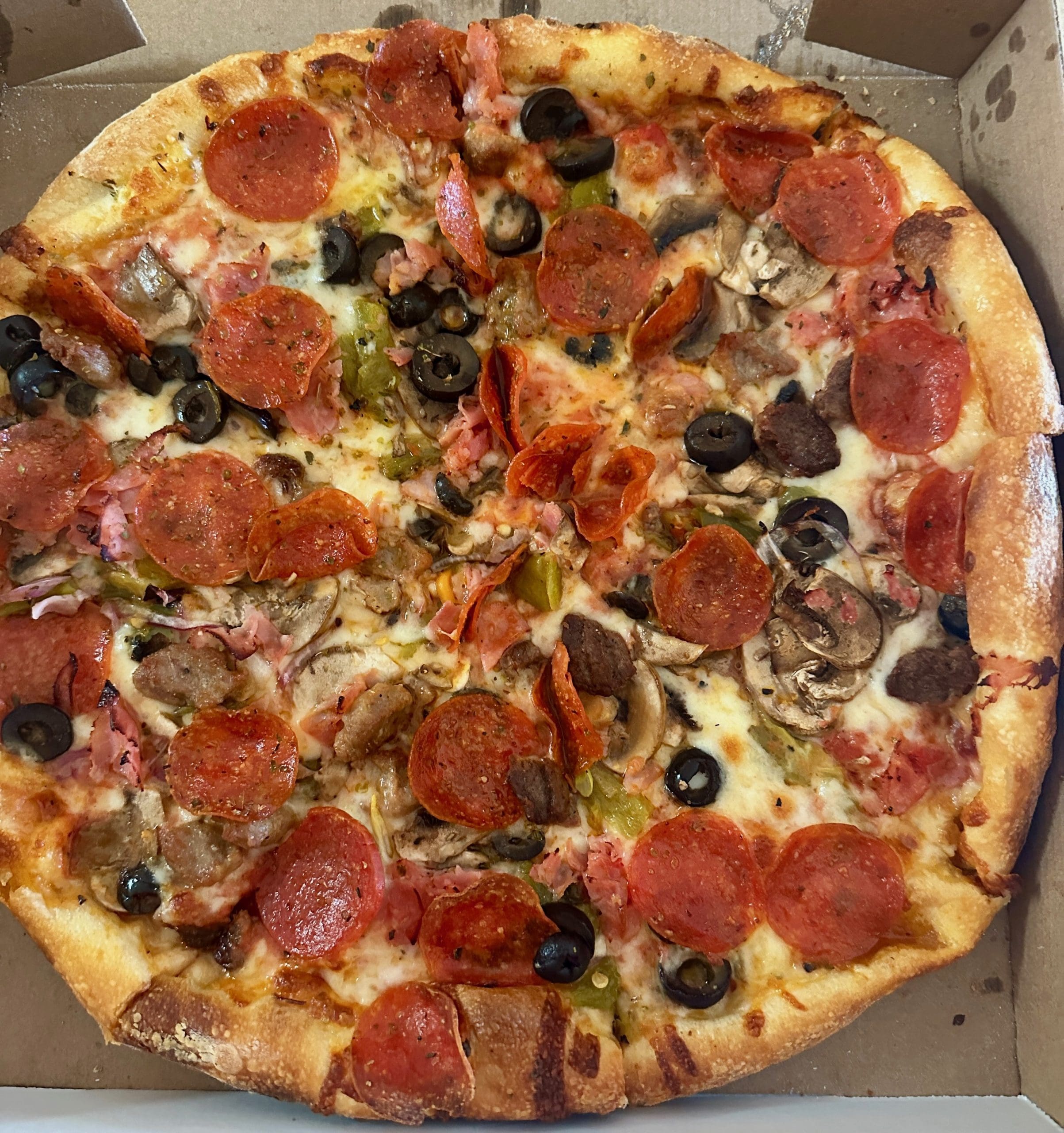 3 May 2025: The term “special” is oft use as a descriptor or adjective for items that don’t deserve that characterization. Not so at Dion’s where The Special (Italian sausage, pepperoni, red onions, mushrooms, black olives, green chile, ground beef and smoked ham) earns that “special” designation. It’s a meat lovers meets veggie pizza with something for everyone. More precisely, this pie has something for everyone who likes everything on a pie. On balance, the veggies probably grab your taste buds a bit more than the meats without being overwhelming. What makes this pizza even more special for me is that it reheats well. That means it’s an excellent pizza for breakfast.