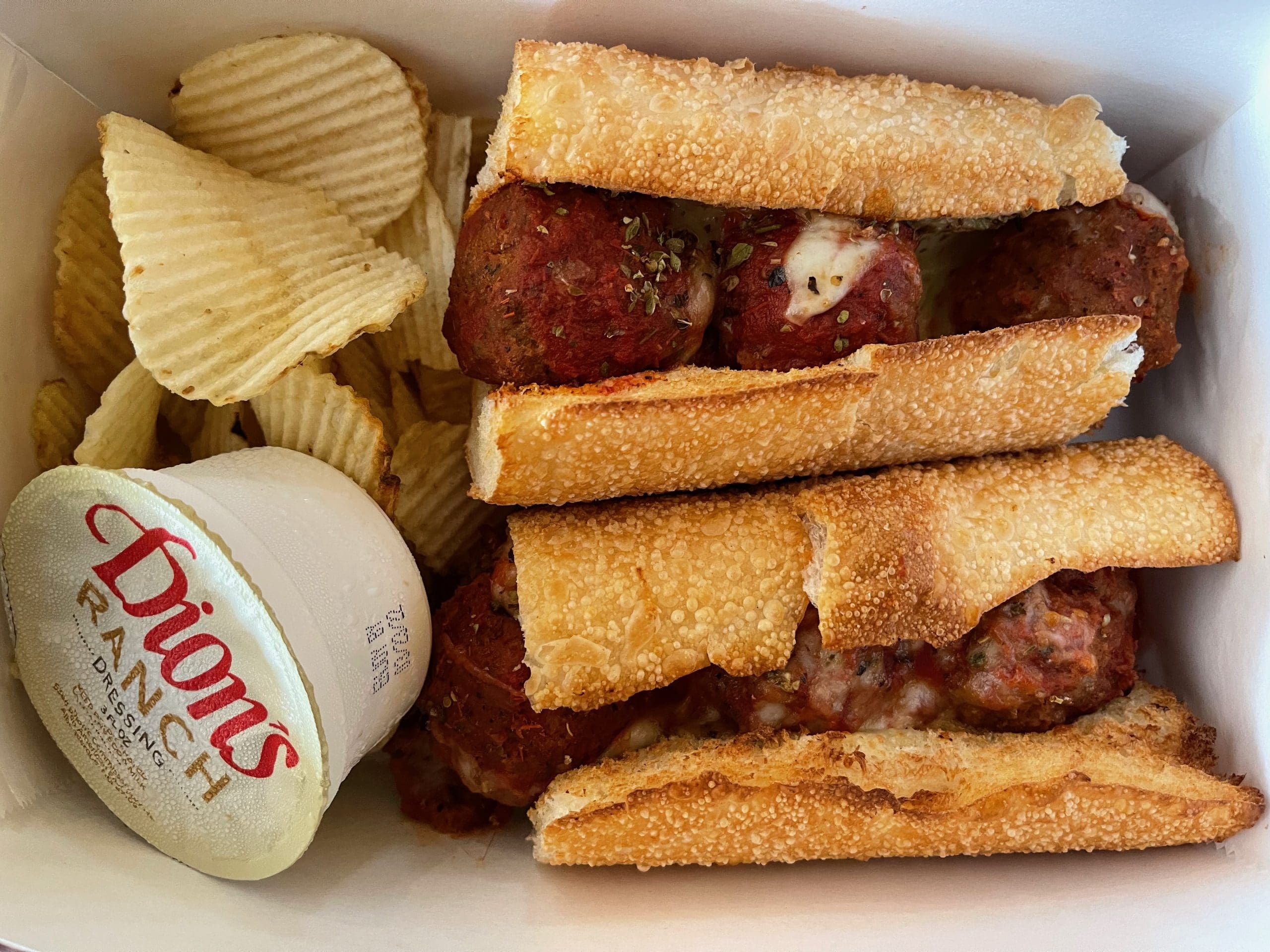 There are two facets to each sandwich which makes them special. The first is the baguettes which are lightly toasted in a conveyor oven to give them a crispy exterior while retaining a pillow soft contrast inside. The conveyor oven melts the cheese but doesn’t warm the beef to a mushy consistency and somehow manages to keep the vegetables crisp and fresh. The second facet is the Greek dressing which is simply terrific, so much so that you’ll want a second portion so that every morsel of sandwich you bite into is infiltrated by the tanginess of this excellent dressing. Save Dion’s ranch dressing for salads, but always use the Greek dressing on the sandwiches.