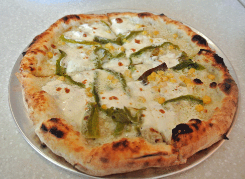 27 July 2013: The Zia “The New Mexico Pizza”, on the other hand, is one of the very best pizzas I’ve had in the Land of Enchantment. It’s constructed with a white cream sauce, house-made mozzarella, Pecorino Romano, corn and New Mexico green chile. The green chile doesn’t hold back on flavor or piquancy. It’s sourced from an organic chile farm in the Socorro area and it’s pure delicious dynamite. Corn niblets lend elements of sweetness and freshness while the white cream sauce proves a worthy alternative to the fabulous tomato sauce. The crust, especially the cornicione, is an absolute delight. It’s bread as good as you’ll find at any bakery, so good you could eat an entire pizza sans ingredients.
