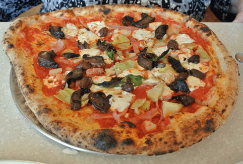 27 July 2013: The pizza crust is a perfect canvas for some of the best ingredient combinations you can find. My play-it-safe bride’s pizza, the Capricciosa “An Italian Classic” showcased tomato sauce, house-made mozzarella, Pecorino Romano, artichokes, mushrooms, Italian cooked ham, olives, basil and olio. There’s an interplay of several flavors in each bite, but the difference makers are the tomato sauce, house-made mozzarella and that wondrous pizza crust. If all bread tasted as good, I’d weigh 400 pounds.