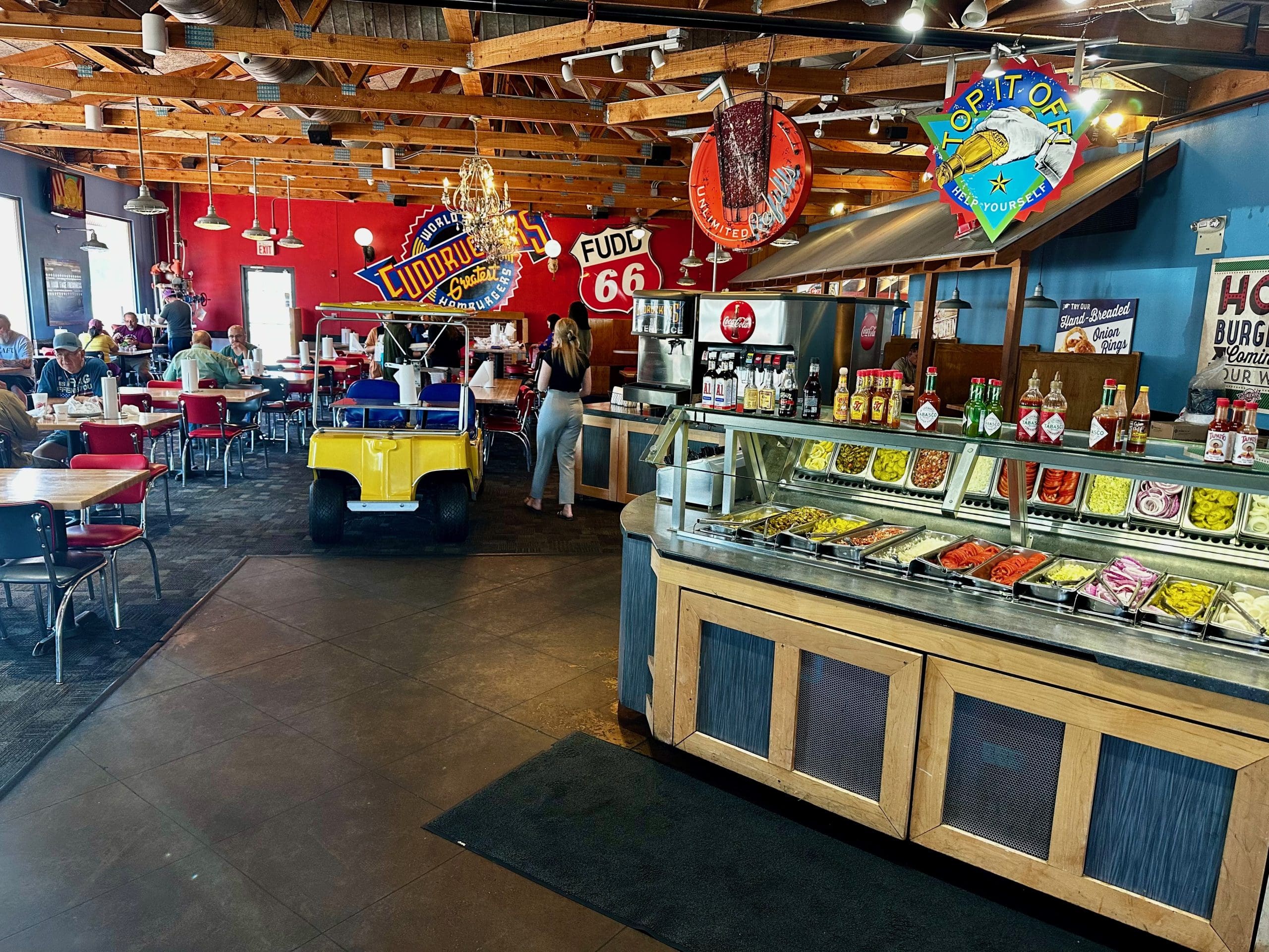 Founded in 1980 by restaurant impressario Phil Romano (of Romano’s Macaroni Grill fame), Fuddruckers has expanded to more than 250 locations across the world including such purveyors of American culture as Saudi Arabia, Egypt and Kuwait. The theme at most of the fast casual franchises is 1950s and 1960s rock and roll. The ambience is Disneyesque, both from the sense that it’s family-friendly and that it’s loud (as in blaring, ear-splitting music loud) and fun (unless you want to hear a conversation with your dining companions). Others might describe it as tacky, gaudy and over-the-top. Ostensibly, Fuddruckers also serves good burgers.
