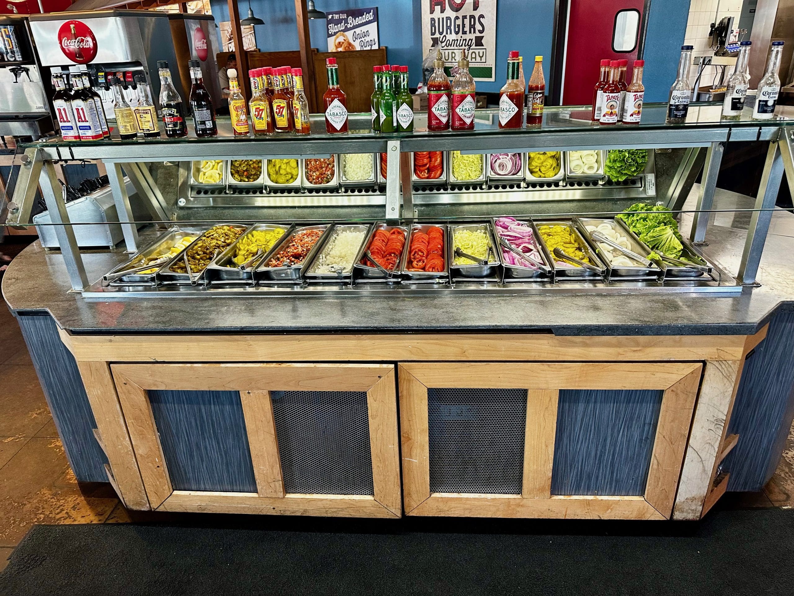 The layout for ‘fixins’ (lettuce/tomato/onion/etc was tidily attended to and there was an ample variety of saucy condiments elsewhere as well.