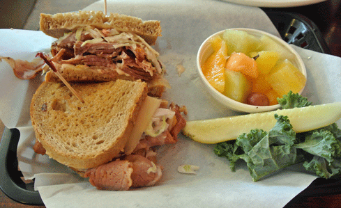 19 October 2013: Nosh’s pastrami sandwich is hand sliced and served on double-baked rye with a side of grainy deli mustard. Compared to most Duke City sandwich makers which scrimp on meats, Nosh’s sandwiches are ungashtupt (Yiddish for overstuffed). The pastrami is lean and peppery with that distinctive deliciousness imbued only on pastrami. Nestled on a double-baked rye with personality and a smear of Ba-Tampte (Yiddish for tasty) deli mustard, it’s a sandwich which just might inspire carnal yearning.
