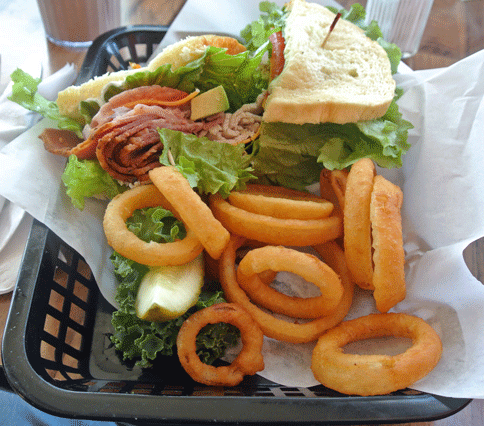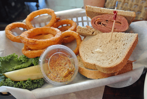 19 October 2013: As with New Mexican chile, pastrami needs no amelioration as it is incomparably fabulous on its own, but if you want to let your hair down, you’ll want to try Nosh’s Amherst, pastrami (or corned beef) with Swiss cheese, Russian dressing and coleslaw on rye. What makes this sandwich sumptuously successful is that the pastrami is still clearly the star. It’s not overwhelmed by the sweet coleslaw or the boldness of the Russian dressing. All sandwiches are served with a pickle spear and your choice of potato salad, coleslaw, onion rings, house or sweet potato fries, or fruit. The onion rings are strictly an out-of-the-bag variety.