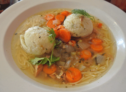 19 October 2013: In a classic Seinfeld episode, George Costanza tells a woman he loves her but is unsure whether or not she heard him. Ever the nurturing friend, Seinfeld’s “consolation’ to George was “that’s one giant matzo ball hanging out there.” Later George ordered matzo ball soup. At Nosh you can order matzo ball soup for breakfast or lunch. It’s good anytime. If you aren’t familiar with or haven’t tried them, matzo balls are a dumpling of sorts. They’re considered a Jewish comfort food favorite. The soup is made from chicken stock, short noodles and vegetables. Save for being just a bit under-salted (my preference), it’s a very good, very healthful chicken noodle soup.