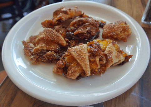 16 December 2013: Rugelach, a Yiddish word meaning “little corners” may not have made it onto an episode of Seinfeld, but it’s available at Nosh where you can purchase them in quantities of one to a dozen. For that Albuquerque’s pastry paramours should be very grateful. Rugelach is a a rolled triangle of dough around a fruit filling. The filling–Nosh uses apricot–is almost caramelized, but it’s not overly sweet. It’s a wonderful pastry.