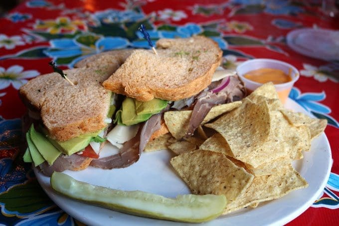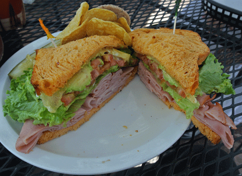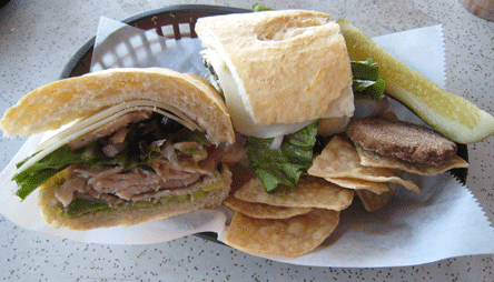 In the November, 2010 edition of New Mexico Magazine I was asked to write an article showcasing the use of turkey for breakfast, lunch and dinner in three Albuquerque restaurants. My featured lunch selection was Golden Crown’s Turkey & Swiss sandwich (served with mayonnaise, Italian dressing, deli mustard, onions, tomatoes, lettuce and a kosher pickle). It is an outstanding sandwich–and thankfully NOT named the “Albuquerque Turkey” as so many turkey sandwiches (particularly those offered by chains) seem to be. Crafted on the Panaderia’s fabulous bread and adorned with vegetables grown on the premises on a hydroponic (a method of growing plants in water using mineral nutrient solutions with no soil) garden, the sandwich is accompanied by a biscochito and chips.
