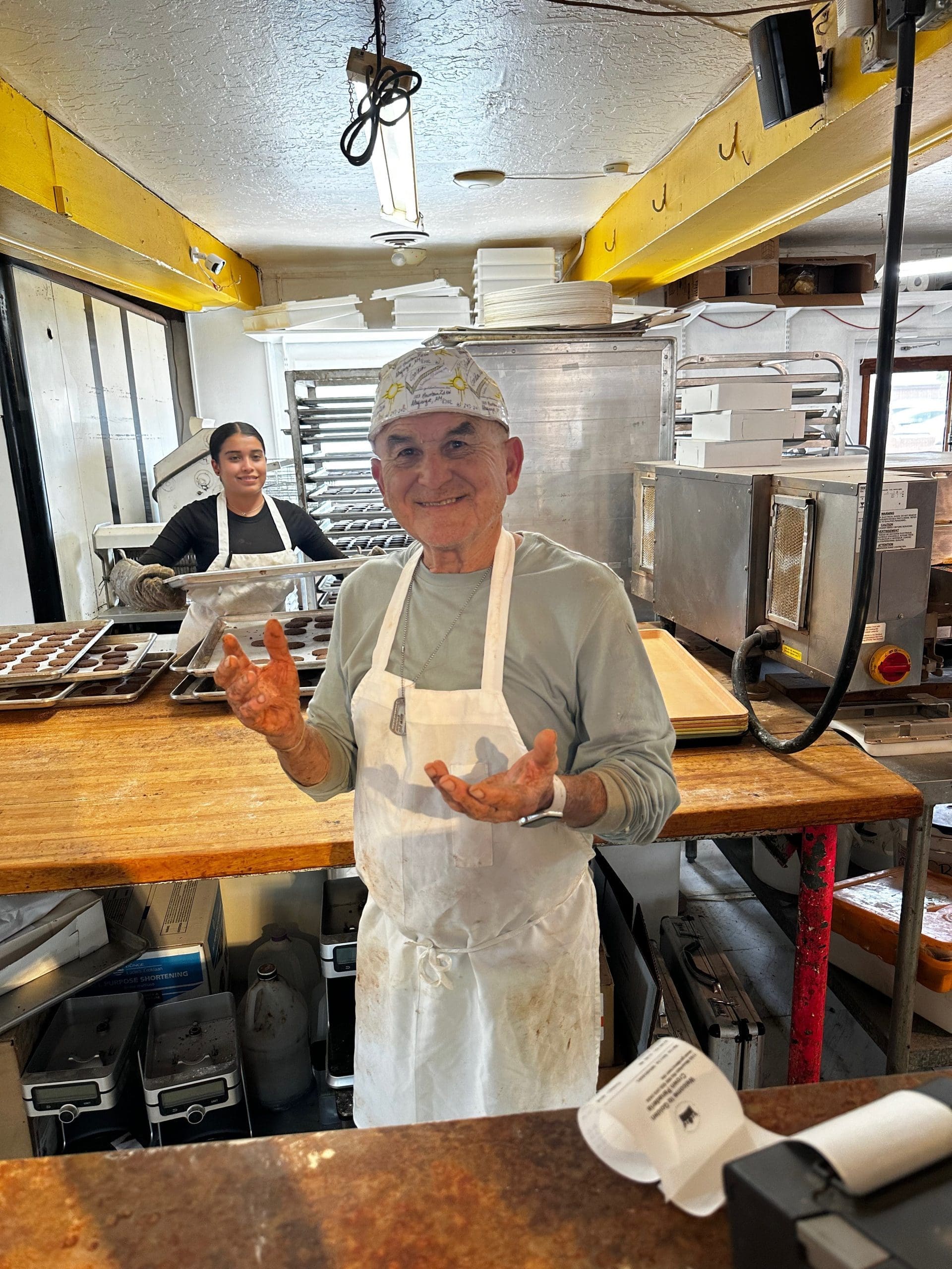 Pratt Morales loves being a baker so much that he often wakes up at three in the morning and walks to work so he can get started on his next sculpting project or bread innovation. We should all love our jobs as much as he does. We should all be as patriotic as he is. Not only does he wear his own dog tags signifying his service in the United States Air Force, he wears his dad’s dog tags. He’s very proud of his dad’s service during World War II. When we visited in September, 2023, Pratt told me Chris was getting ready for a tour of bakeries throughout Europe. It made me wonder who will be teaching whom the art of bread-making.