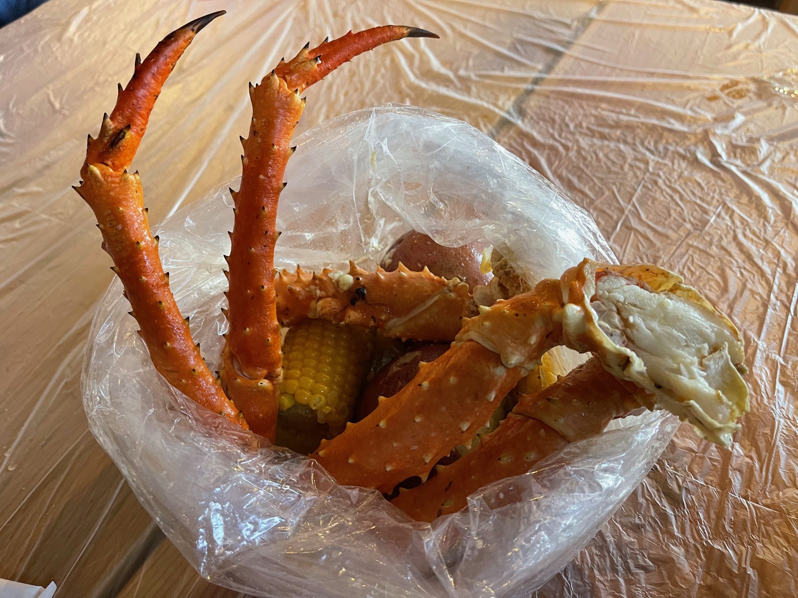 There are a couple of cautionary statements you should heed when partaking in a seafood boil: (1) it can get pretty messy as in buttery liquids running down your chin onto your shirt; and (2) you’ll want to use the bib provided by your server to protect that shirt. Better yet would be cutting a hole in a trash bag and putting your head through it. That would be fitting because the seafood itself is served in a clear trash bag (which really should be called “treasure bags” considering what they hold). Make that two trash bags (double-bagging). The inner bag is tied at the top. You’ll have to untie it then fashion it into a makeshift bowl before you can indulge in your seafood fantasy.