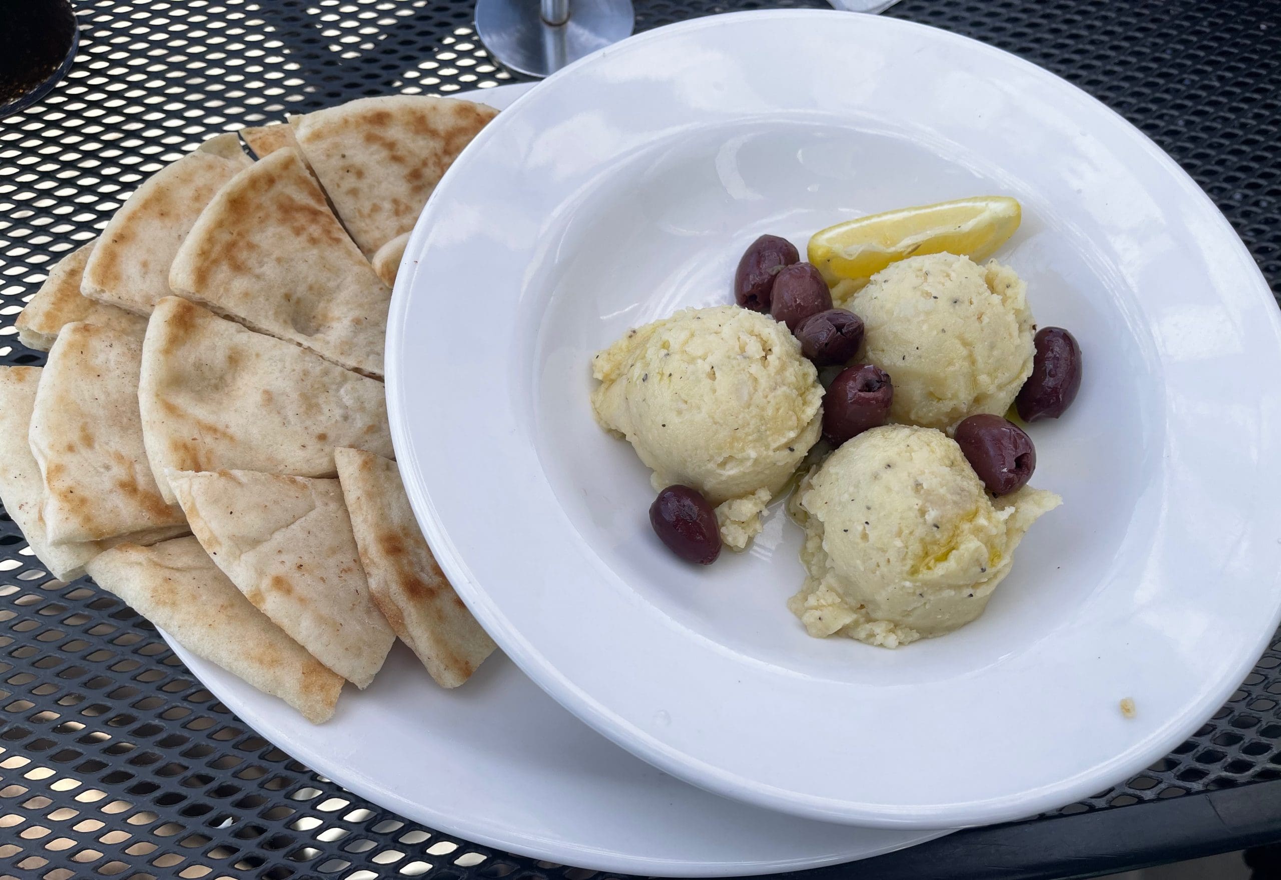 Among our favorite appetizers is one that may sound somewhat unconventional to the American palate. Greeks have long used potatoes as a vehicle for complementary ingredients. In Skorthalia, an appetizer at Gyros Mediterranean, potatoes served cold and the consistency of mashed potatoes are blended with lemon juice, garlic, olive oil and white wine. The tart-savory potatoes spread easily onto the pita bread and make for a delicious starter. We weren’t able to finish our skorthalia and were happy to learn it seemed to improve with time and it was pretty darned good to begin with.