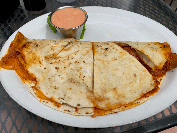 17 May 2019: Lunch enjoyment might start with the carne adovada crisp, a quesadilla in which crisp flour tortillas envelope lean pork marinated in red chile and melted cheese. Why more quesadillas don’t feature carne adovada is beyond me, but even if they did, it’s doubtful they can duplicate this artfully crafted appetizer. Although the red chile isn’t especially piquant, it’s very flavorful with a garlicky taste which complements the rich red chile.