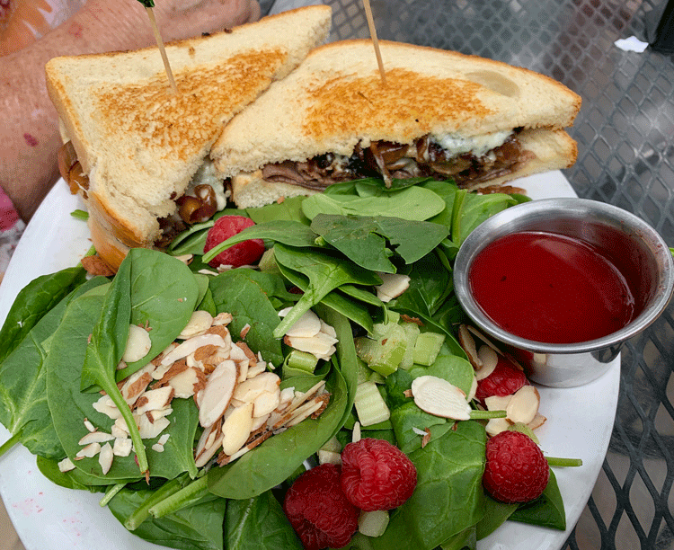 17 May 2019: Hannah & Nate’s is a home decor and market cafe ideally suited for gentrified ladies with a lot of leisure time on their hands. It’s not a restaurant at which a boorish lout will sit patiently then be satisfied with what he would consider “finger foods.” Take for example the “beef & bleu” sandwich featuring sliced roast beef, caramelized onion and sautéed mushrooms topped with bleu cheese on grilled sourdough. It’s not four inches thick the way such men would want it and the bleu cheese isn’t powerful enough to give us the belch inducing halitosis powerful enough to clear a room. What it is is one fantastic sandwich even though my Kim likes to enjoy it with a spinach salad instead of fries (the raspberry dressing is fantastic!).