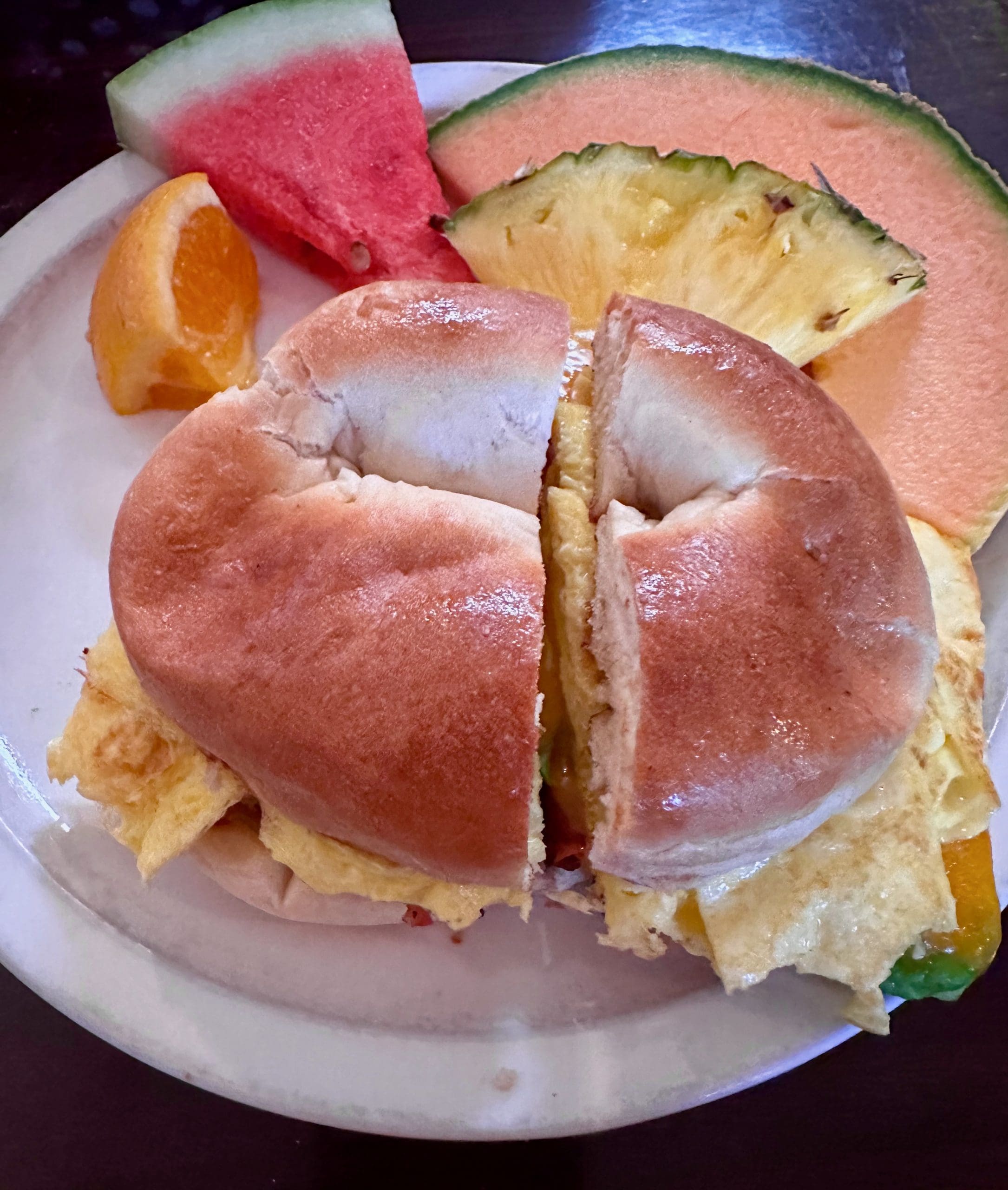 9 August 2023: Hannah & Nate’s is a restaurant that truly exemplifies the “have it your way” edict. Take for example, the New Mexico Breakfast Bagel (a sliced grilled bagel topped with two scrambled eggs, two slices of bacon, diced green chile and topped with Cheddar cheese served with a side of salsa and diced red potatoes tossed with caramelized onions). By the time my Kim got done customizing the sandwich, it was almost unrecognizable…almost. The bagel, Cheddar cheese, bacon and two scrambled eggs were still in place, but what makes it a “New Mexico” sandwich was omitted. That’s right! No green chile! Sacrilege, I know, but she can no longer handle the piquancy of our state’s official state vegetable. Instead of the diced red potatoes tossed with caramelized onions (a wonderful side), she asked for fruit. Our server accommodated my bride’s request and in the process maybe uncovered a new dish.