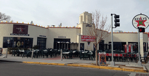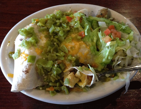 Breakfast goers will appreciate the bottomless coffee which is complimentary with breakfast and is replenished faithfully by an energetic wait staff. The coffee is the antithesis of Starbucks in that it’s smooth and acid-free, an easy blend with which to start the day. It pairs well with Kelly’s Build Your Own Breakfast Burrito which starts with three eggs and potatoes. From there you have your choice of meat (bacon, ham, chorizo, chicken, turkey), veggies (including mushrooms and olives) and chile (red, green or both). All is not lost even though both the red and green chile are made with cumin. You can ask for chopped green chile instead. The chile is fresh and has a discernible piquancy though most New Mexicans can handle it easily.