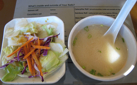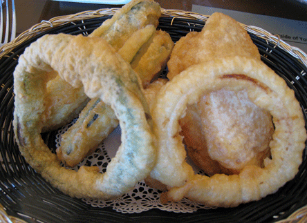 Shortly after being presented with the sushi menu, an attentive server will bring to your table, a warm bowl of traditional miso soup and a salad with orange-ginger dressing. Neither are particularly exciting, but then you’ll probably be so eager to get to the sushi that they wouldn’t leave much of an impression even if they were noteworthy. Appetizers are much more interesting, albeit fairly standard: Chicken Yakitori, Egg Roll, Fried Calamari, Vegetable Tempura, Shrimp and Vegetable Tempura Aged Tofu, Edamame and Gyoza. The vegetable tempura is excellent, each succulent vegetable crispy on the outside and perfectly cooked inside.