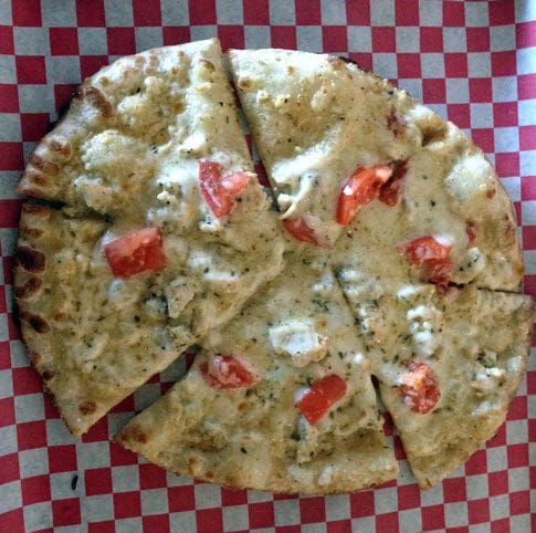 10 December 2014: While chatting recently about American cuisine with a young Vietnamese server at Viet Q, he dismissed (maybe even dissed) American burgers but admitted to having fallen in love with pizza–but only if it’s topped with green chile. As with our sacrosanct green chile cheeseburgers, New Mexicans love to top their pizzas with our official state vegetable. At Wise Pie, chile is available not only as a topping, but as a chief component of one of its sauces. The green chile Alfredo sauce on the Fredo actually packs an occasional kick–not with every bite, but sneakily. Other components on this pizza are roasted chicken, a Provolone cheese blend, Roma tomatoes and Parmesan cheese. On those bites in which the green chile makes its presence felt, this pizza rocks. When the green chile isn’t discernible, it’s still good. For better results, ask for green chile and the green chile Alfredo sauce.