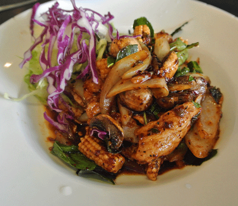 1 February 2014: Tara Thai’s “pad” menu is as exciting as any you’ll find in New Mexico. Pad, a Thai term which describes stir-fry, is a specialty of the house with ten items on the “wok” menu. Pad Pet is the choice for heat lovers, not for the faint of heart. Though you can request it be prepared at “mild” or “medium” levels of heat, you’re still going to feel the burn. It’s a good burn, a delicious burn. The heat comes from sautéed red chili paste on a stir-fry dish which includes baby corn, mushroom, onion, bamboo shoot, garlic and Thai basil. Feel the heat and love it with this dish!