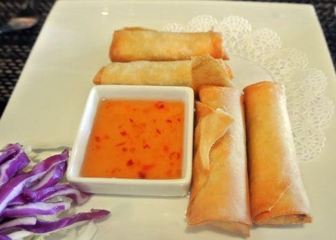 11 October 2014: The Fall specials menu in 2014 included chicken spring rolls, a terrific option you don’t see very often in a pork or vegetable dominated spring roll market. The chicken spring rolls, four to an order, are engorged with chicken, cabbage and onion and are served with a housemade sweet and sour sauce. As with many Thai spring rolls, these are fried to a golden hue, leaving the wrapper crispy. There’s a nice balance, both in quality and in flavor accentuation, between minced chicken and vegetables. Alas the “sweet and sour” sauce is a misnomer in that sweet is the dominant taste (to an extreme extent). The chicken spring rolls deserve better.