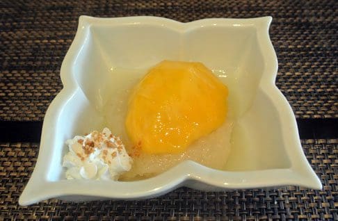 11 October 2014: With eight items, Tara Thai’s dessert menu is actually quite sizable compared to many Thai restaurants. Every dessert listed is inviting and tempting, but in-season, there can only truly ever be one option: mangoes with sticky rice. In Thailand, this delightful dessert is actually a finger food eaten by rolling the rice with the fingers and scooping up mango slices. There’s too much coconut milk on Tara Thai’s version for Thai-style eating, not to mention American sensitivities. At any regard, this is a wonderful dish, one we miss greatly when mangoes go out of season.