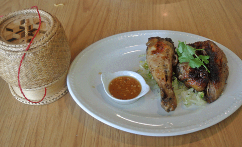 22 February 2014: There are a number of Lao dishes interspersed throughout the menu, but there’s also a page dedicated solely to the cuisine of Laos. Alas, there are only six items on that page, but they include some of the Lao dishes with whom acculturated Americans are familiar: Laab, beef Jerky, Lao sausage and Lao papaya. The menu also includes a Lao grilled chicken served with sticky rice and Mekong chili tomatoes sauce. The grilled chicken–a leg, a breast and a thigh–is dissimilar to the way grilled chicken is prepared in Mexico in that it’s not infused with charcoal flavor. Though there is a pleasant smokiness, the grilling influence penetrates deeply and it’s delicious. The accompanying sticky rice is served in a cute little wicker basket that retains heat.