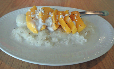 22 February 2014: Our preferred way of enjoying sticky rice is with mangoes, the quintessential Thai and Lao dessert. Few desserts of any nation are as wonderful as mangoes with sticky rice, especially when the mangoes are in season. In-season means their flesh is a sweet and intensely tropical with a fragrant aroma and a fibrous texture around the pit. The intensity of mangoes in-season marries oh so well with the sticky rice which swims with rich, sweet coconut milk.
