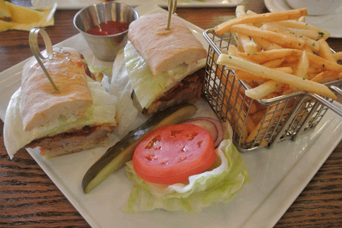 1 March 2014: Adventurous diners might eschew burgers for something just a little bit different–perhaps something you’ve had before, but prepared in a uniquely creative manner. One option is the Monte Cristo Porchetta, a sumptuous sandwich stuffed with slow-roasted pork, Fontina, Gruyere and a fried egg on top served with a ramekin of an Ancho chili-wild berry sauce. The sandwich needs absolutely no amelioration, but that sauce gives the otherwise boring French fries some personality. The porchetta (pork) is nicely roasted with a crispy skin and is seasoned with aromatic spices and herbs which imbue it with addictive properties. Our only complaint about this sandwich is that it didn’t have enough pork (a roast would have been good).
