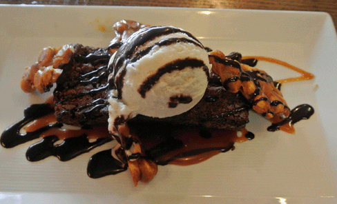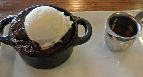 1 March 2014: During our three years in England, we often enjoyed sticky toffee pudding, a lush muffin-like mound of bread pudding topped with a rich caramel toffee. It’s a high-calorie indulgence rich in flavor and deliciousness. The Stumbling Steer’s version takes a couple of liberties from the English version. These liberties–a sea salt toffee and vanilla ice cream–work very well. The sea salt toffee, in particular, lends just a modicum of savoriness to what would otherwise be a too sweet, too rich dessert. One of the most common mistakes made with bread puddings is the absence of savoriness to offset the cloying nature of the dessert. The toffee is served in a small pitcher and can be dispensed onto the bread pudding in quantities you control.