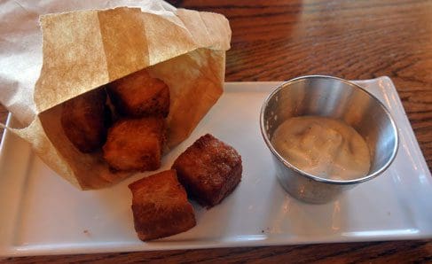 Kricket, a faithful reader of Gil’s Thrilling (And Filling) Blog (and one who should comment more often) may be The Stumbling Steer’s biggest fan. Her enthusiasm for the gastropub prompted our inaugural visit: “Gil, I beg of you, review The Stumbling Steer. I keep saying I will try different appetizers, but those fried pork bites are like bits of pork belly *butter* and I can’t avoid ordering them. This place has my undying loyalty (and if they delivered, my arteries would last about a week).” The fried pork bites were initially available as an appetizer only for dinner, but are now a mainstay in the standard menu.