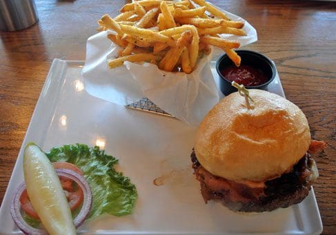 28 November 2014: Give the Stumbling Steer an “A” for effort alone in crafting deliciously different burgers which don’t stray too outlandishly far from tradition. The eponymous Stumbling Steer Burger is of the most creative offerings on the menu. Starting with a half-pound of Angus ground beef, this burger is a melange of delicious ingredients: pastrami, mushrooms, onion relish and Gruyere cheese with red onions, tomato and lettuce on the side. To maximize your enjoyment, eschew the “on the side” ingredients (the tomato is typical of the artificially ripened variety, who needs red onions when you’ve got onion jam and the lettuce is cold and wilted). The onion relish is caramelized in the fashion that renders onions deliciously sweet and tangy. It’s my favorite ingredient in a pretty good burger that truly takes two hands to handle.