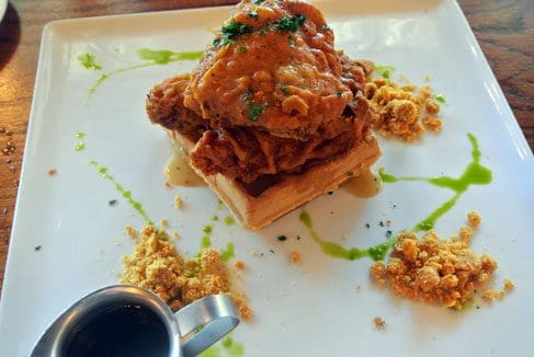 28 November 2014: In recent years, America has embraced the soulful Southern staple of chicken and waffles and Albuquerque has followed suit. Fried chicken is one of the most versatile of American comfort foods because it’s wonderful on its own and maybe even better when paired with sweet or savory partners (the old “gravy vs. syrup conundrum.”) The Stumbling Steer’s fried chicken (breast, thigh and leg) is fried in duck fat and stacked atop a Belgian waffle with a Corn Flake streusel and real maple syrup. The fried chicken is moist and delicious with a crispy batter (but not too much of it). If there is one surprise in this entree, it’s the Corn Flakes streusel which should be sprinkled liberally on the waffle (or chicken) for best results.