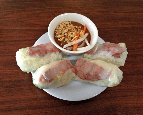 8 March 2014: Spring rolls are a marvel of transparency. Thanks to a translucent rice paper, the grilled pork, lettuce, cucumbers, and vermicelli noodles are available for your inspection. Not that you’ll study them for long because they’re too enticing for contemplation. The solitary pork strip, grilled in the inimitable Vietnamese way that makes pork taste like candy, is the star ingredient unless you call the peanut sauce an ingredient. The peanut sauce (crushed peanuts, julienne carrots and daikon) is simultaneously sweet and savory. You might want to eat it with a spoon, but should save it for your spring rolls.