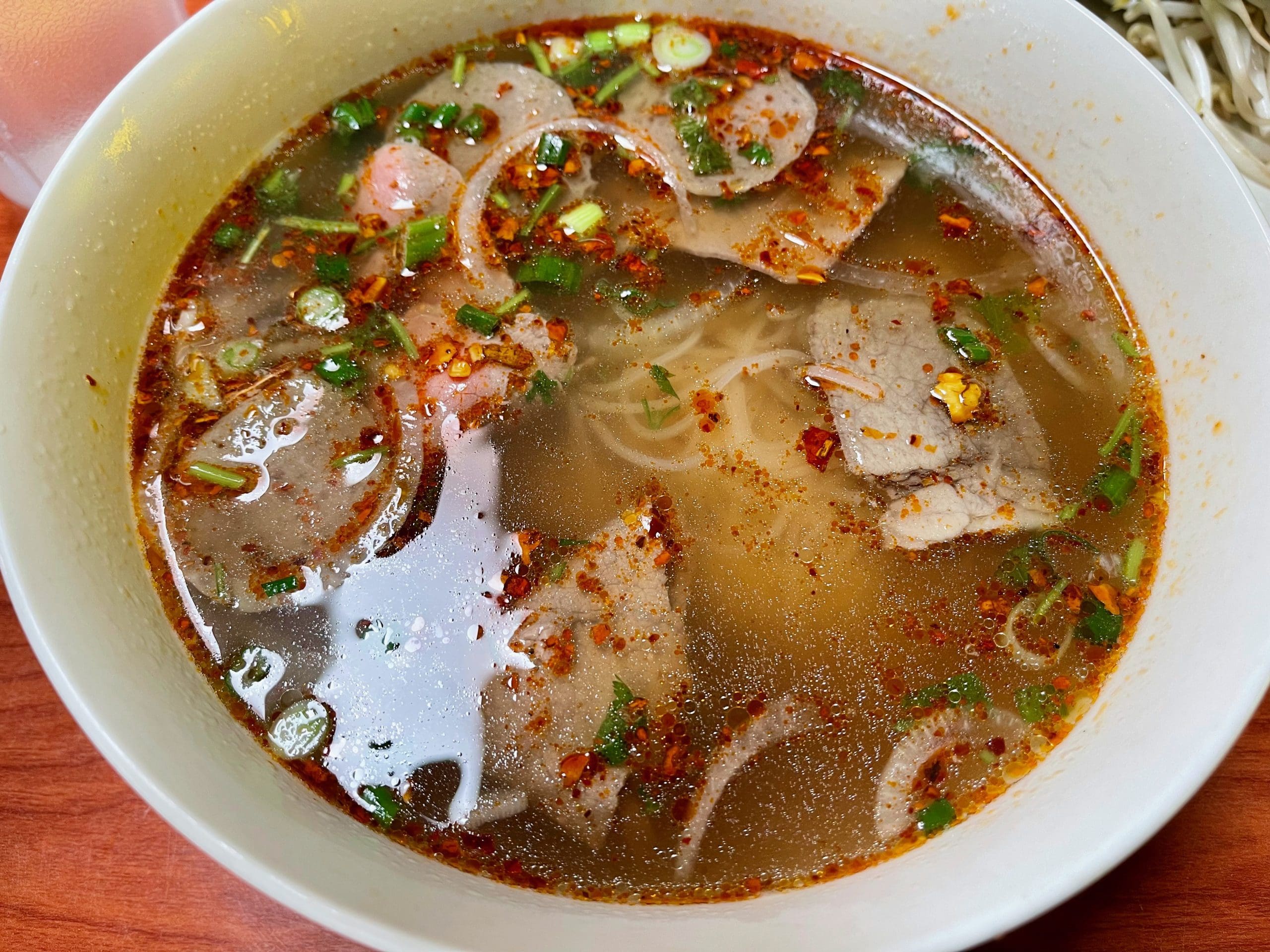 11 November 2022: When my friend and colleague Tuan Bui and I get together for a meal at one of our favorite Vietnamese restaurants, we invariably scour the menu for Bún bò Huế, a spicy beef noodle soup from the Central Vietnamese city of Huế. Our November, 2022 visit to Pho 79 was his inaugural visit. Predictably, neither of us was long-faced for too long at the absence of Bún bò Huế. That’s because we espied Spicy Deluxe Pho (Phở đặc biệt Sate) on that menu. This spicy and wonderfully fragrant dish is bursting with aromatics such as lemongrass, garlic and shallots all simmered in a beef broth and served over egg or rice noodles. “Sate” is pronounced the same as Thailand’s “satay,” but is wholly different. In Vietnam, sate sauce is a chili sauce made with red chilis, garlic, shallots, dried shrimp or fermented shrimp paste, and sugar. The sauce is spicy and used for marinades, bbq sauce, soup flavorings, and more. You can see chili flakes swimming in the rich broth. You can taste the potency of that chili with every spoonful.