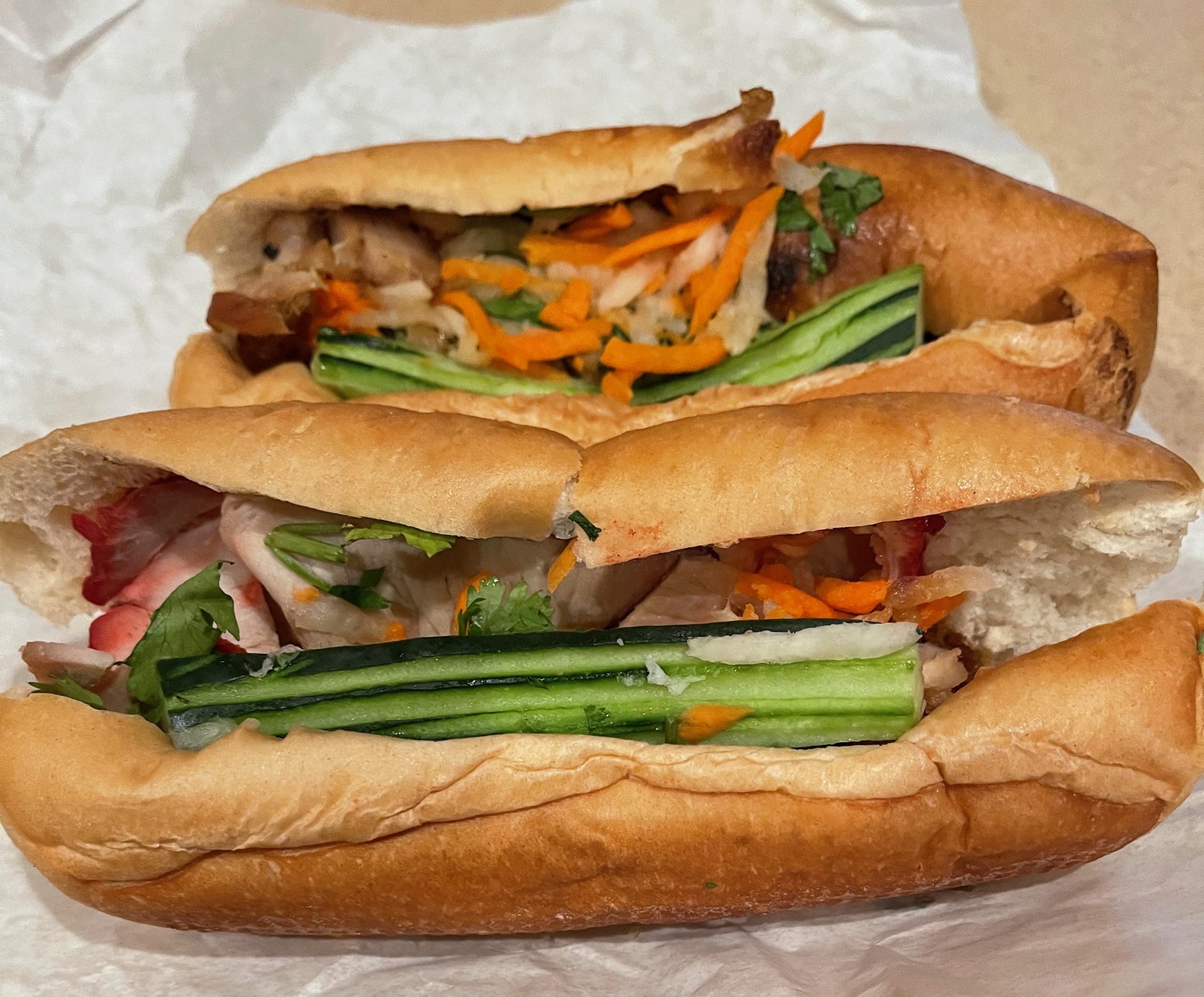 11 November 2022: Pho 79 offers four banh mi: combination grilled meat sandwich (pork, chicken and beef), grilled meat sandwich (beef, pork or chicken), BBQ pork sandwich and a tofu sandwich. Each is prepared on a soft, chewy six-inch baguette and is stuffed with all the characteristic banh mi toppings: shredded carrots, julienne daikon, cilantro and cucumber. I brought two home for Kim’s lunch and dinner. She loved the grilled pork banh mi most of all. The grilled pork is bursting with grilled barbecue flavor. Because some of the pork is caramelized, it offers a delicate balance of sweet and savory flavors. This is a delicious banh mi