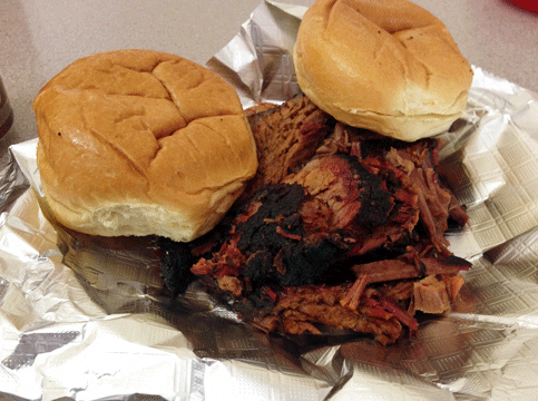 27 March 2014: Your best bet if you want to sample more than one meat is the two meat plate with your choice of two sides. Make one of those meats the hot links, emphasis on the word “hot.” That’s hot as in hotter than eighty percent of the chile served at New Mexican restaurants in the Duke City area. Not only are these luscious links hot, they’re moist and delicious. You’re well advised to eat these last because you might not be able to taste the other meat on the plate…and if the other meat is pulled pork, you’ll want to be able to discern every nuance. The pulled pork has a pinkish hue with a darker “ring” denoting the smoking process. It’s sweet, moist and absolutely delicious–with or without sauce.