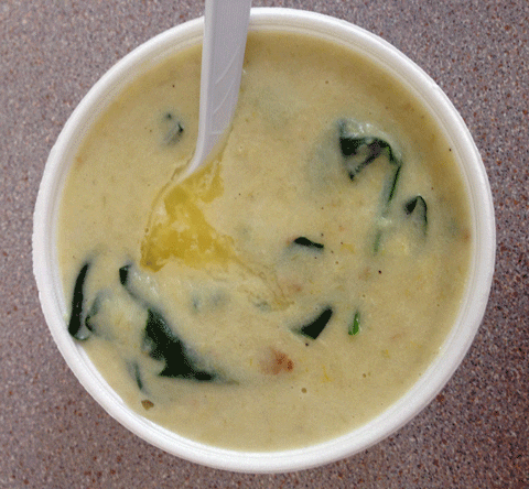 9 April 2014: The soup of the day during a subsequent visit was a potato and leek soup with spinach. It’s a hearty, creamy and very tasty soup served hot. The flavors of leek and potato harmonize very well and the spinach lends nutrients, texture and its very own unique flavor profile. This is the type of soup you’ll love best during cold winter days, but it’s wonderful any time.