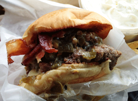 The menu warns that “Our New Mexico green chile is hot!” That’s hot with an exclamation point. Frankly, most New Mexicans won’t wince at its piquancy (or relative lack thereof), but we’ll certainly appreciate its roasted flavor and fruity nuances. A few strips of bacon are a perfect, salty complement to the green chile as is the rich, gooey Monterey Jack cheese. Even with a double, you might want to order two of these burgers. With a bun not more than four inches around, they have a subliminal effect of appearing small even though with double meat, they tower above most chain burgers. The Shake Foundation’s burgers are (usually) juicy and absolutely delicious, well worthy of New Mexico Green Chile Cheeseburger Trail consideration.