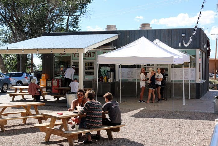 Built on a site which for fifty years housed a gas station, the Shake Foundation isn’t much bigger than a roadside stand, but offers an ambitious menu belying its Lilliputian size. This burger hop is strictly a walk-up operation with several picnic tables for sitting. A number of stately deciduous trees provide seasonal shade and help block New Mexico’s winds. Heavily trafficked Cerrillos is scant feet away from the restaurant, but you don’t get the sense of being “in town.”
