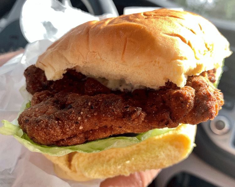 3 November 2019: If it’s true that a picture conveys a thousand words, the image that probably came to mind when you espied the spicy fried chicken sandwich (above) may have been of crawling along a wind-blown and sandy desert…and if you think the picture conveys how dry this chicken sandwich was, imagine eating it. My friend Foodie Star might have described it as being fried to within an inch of its life. Seriously, there was very little moistness left inside. Not even the green chile mayo and brined pickles helped. Had we not been on the road, this is one we would have sent back.