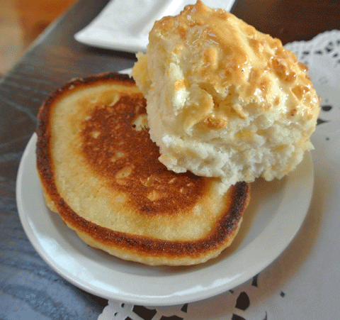 Should you eschew the all-you-can-eat gurgitator’s fest, there are plenty of attractive options on the lunch and dinner menus. In fact, none of the buffet items are duplicated on the menu. As you’re perusing the menu, a server will deposit a Cheddar biscuit and a hoecake on a plate. There are several condiments on your table, including syrup should you wish to treat your hoecake like a pancake. If your tastes lean more toward the piquant, douse the hoecake in Paula Deen’s Tabasco-like hot sauce which is quite good. The Cheddar biscuit needs nothing added thanks to butyraceous qualities that even prevent it from crumbling.