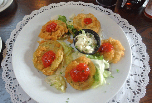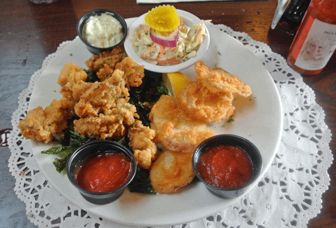 One of the more popular entrees, according to my server, is a fresh seafood platter offering your choice of shrimp, scallops or oysters, batter-fried or sauteed and served with coleslaw and your choice of sweet potato chips or jelly roll fries garnished with fried-collard greens. The platter also includes ketchup, cocktail sauce and tartar sauce though you can also apply any of the condiments on your table (hint: that Paula Deen hot sauce is pretty good if you like cayenne.)