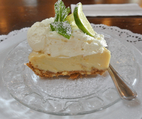 As in so many Southern restaurants, you won’t find a compendium-like list of desserts at The Lady and Sons. In fact, there were only four choices, two–pecan pie and key lime pie–of which seem to be de rigueur at all Southern restaurants. The key lime pie is very good! It starts with a great foundation in which a Graham cracker crust is paired with slivered almonds, the latter a very pleasant surprise. The pie filling is redolent with key lime juice, lime zest and sweetened condensed milk. It’s not quite lip-pursing sour, but offers a discernible tanginess you’ll enjoy very much.