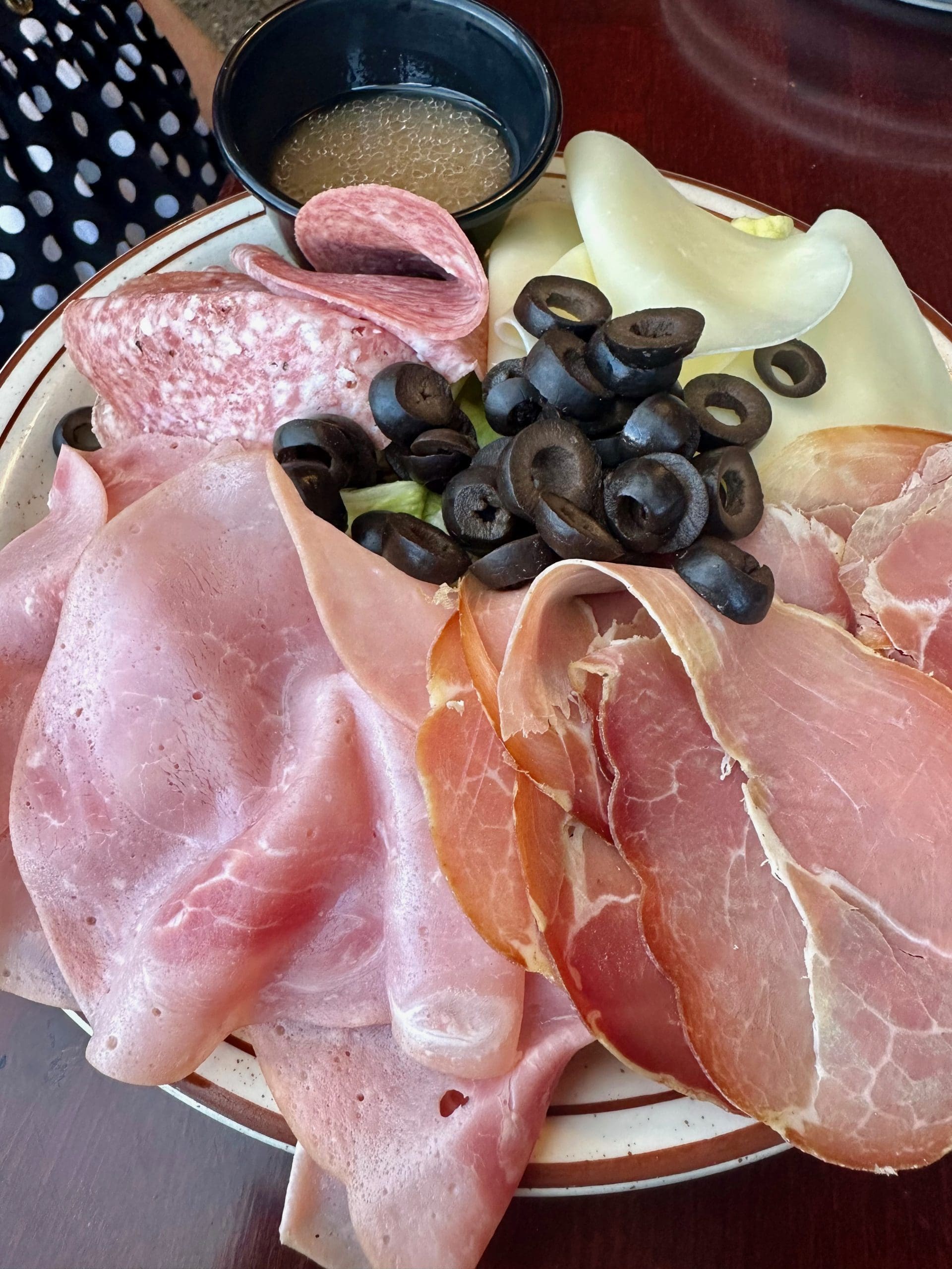 8 September 2024: As oft mentioned (but never lamented) on this blog, many restaurant menus include a charcuterie plate. Old-fashioned, unpretentious Italian restaurant standards like Luigi’s and Sal’s Ristorante and Pizzeria offer antipasto instead. Luigi’s antipasto misti listing on the menu doesn’t brag about its “imported cheeses and cured meats.” This antipasto is described as “mixed cold cuts over a bed of lettuce.” Those of us who grew up enjoying cold cuts will love this plate. Mixed cold cuts include salami, ham, prosciutto, provolone and olives with a side of Italian dressing. Sit in the back dining room and you can even watch NFL games while you nosh. For what more can you ask.