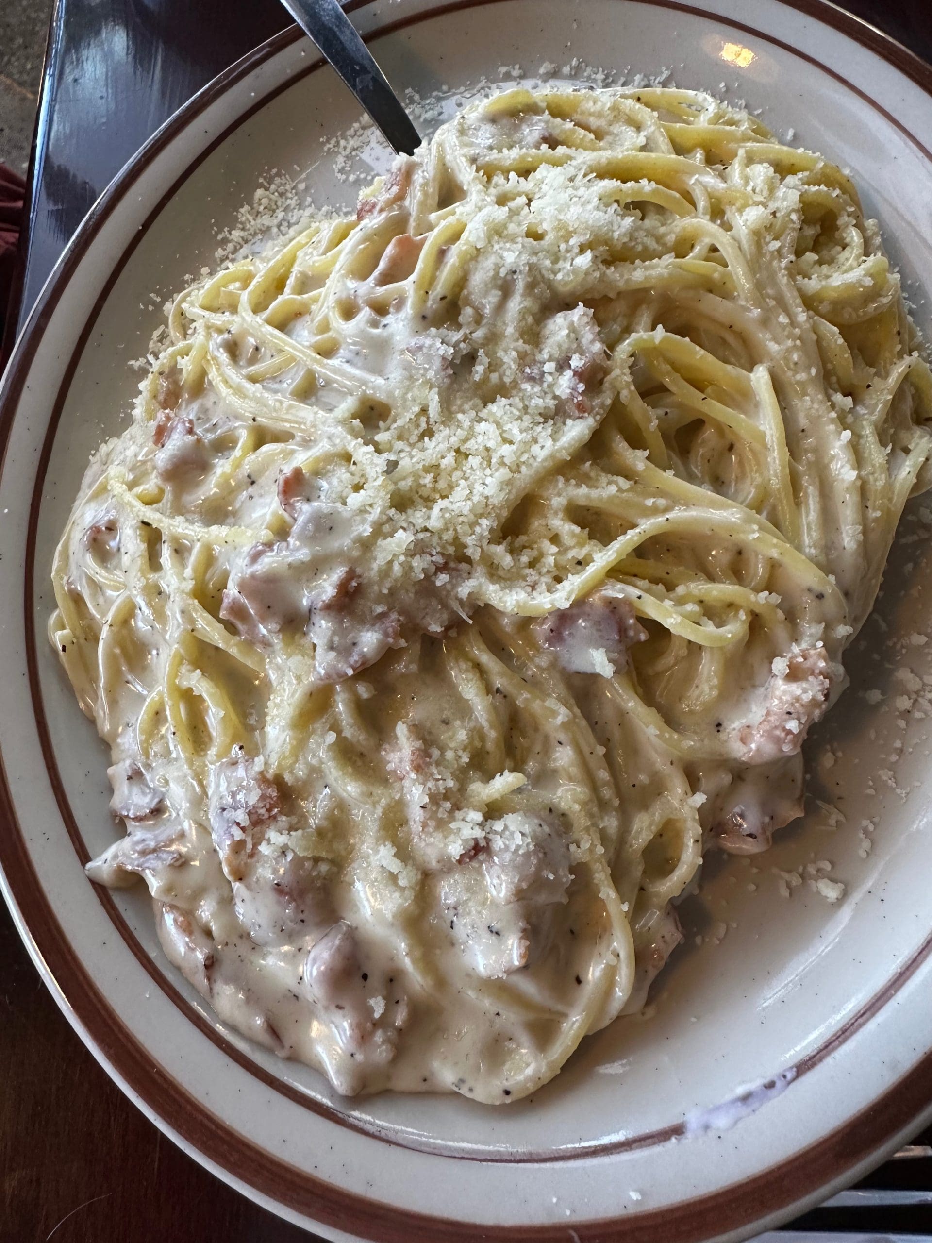 2 November 2024: In the 1986 Nora Ephron movie Heartburn, Jack Nicholson and Meryl Streep enjoyed a post-lovemaking spaghetti carbonara in bed. Nicholson’s character declared “This is the best spaghetti carbonara I’ve ever had. When we’re married, I want this once a week.” Spaghetti carbonara is one of my very favorite Italian dishes though it’s often so rich and creamy that once a week would be too much. Nor can I ever finish an order in one sitting. My Kim can’t either–so she usually has enough left over for another full meal. As is the case with many Italian pasta dishes, Luigi’s spaghetti carbonara (cream sauce made with pepper, bacon and Parmesan cheese) is even better the next day when the cream sauce has fully penetrated every strand of spaghetti.