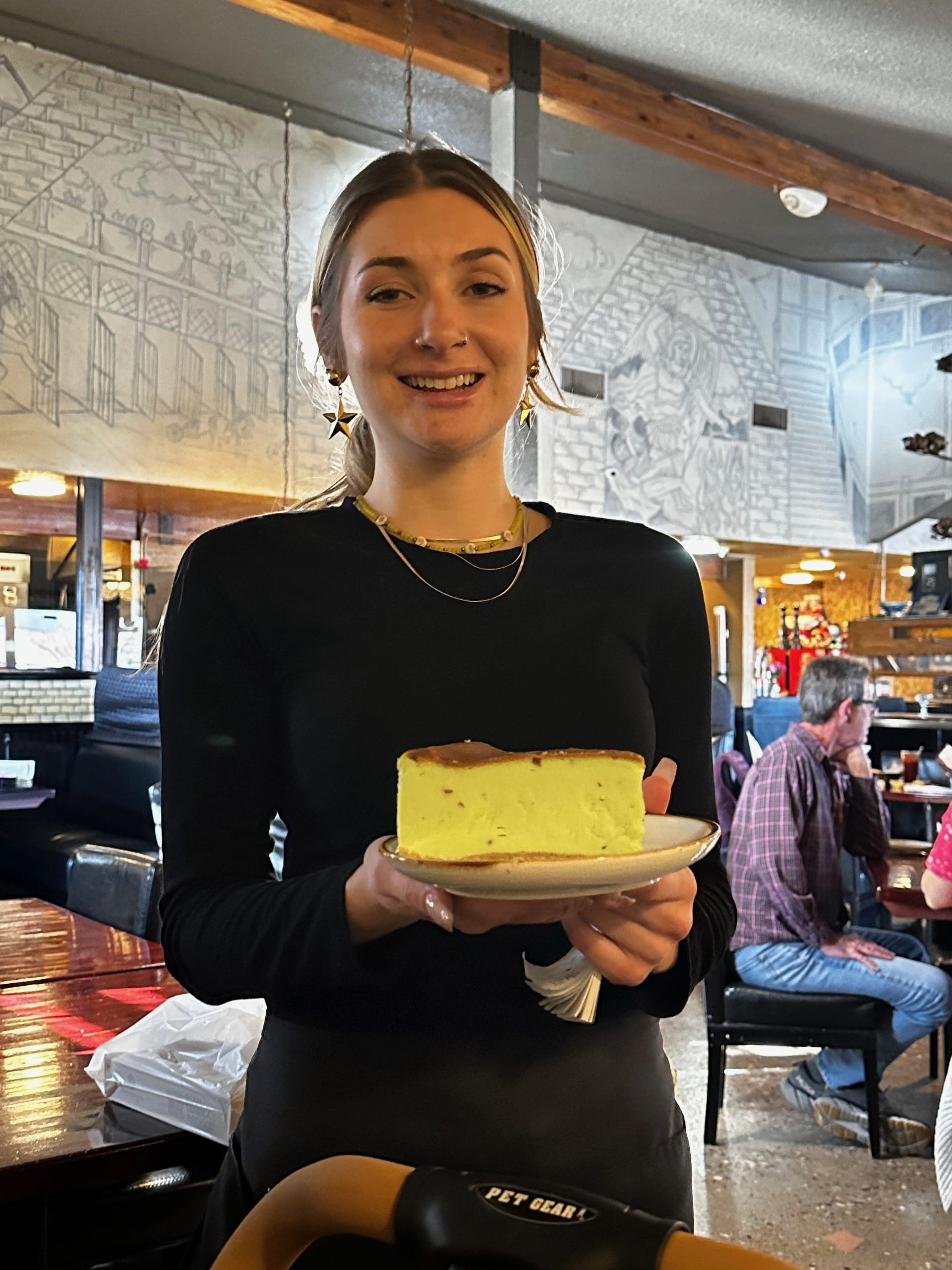 2 November 2024: Earlier in this essay, I mentioned the homey touches of the restaurant’s decor. Homey would also describe the service at Luigi’s. The wait staff is personable and attentive without hovering over you while you’re trying to eat. The first time we met her, Sabrina, our gregarious server for three of our 2024 visits should have worn a big red letter “S” on her chest for the way she simultaneously took care of sixteen tables–professional service with a smile, too. On a Sunday when no other server showed up for work, she managed to keep everyone happy. She’s come to know us pretty well. When I expressed curiosity about other cheesecakes on the menu, she brought a thick slice of pistachio cheesecake to our table. Obviously she knew I wouldn’t be able to resist it.