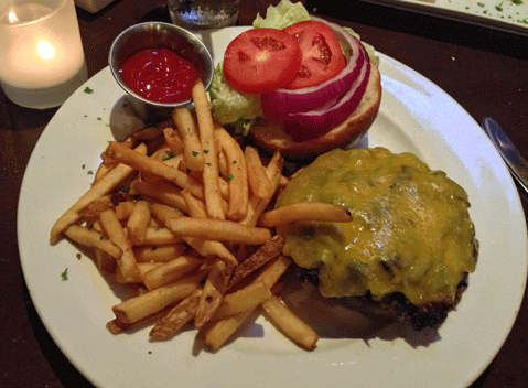 9 August 2013: You’re also well advised to heed any culinary recommendation from Bruce Schor, a bon vivant who rates Blades’ Rustique Bistro green chile cheeseburger as among the very best he’s had in the Land of Enchantment. What distinguishes this burger from so many others is the Angus reserved beef from which it’s made. Angus reserve beef is consistently tender, juicy and rich with flavor. With the Bistro burger, you might swear you’re eating a fine steak nestled between a hardy Brioche bun. The green chile, splayed generously beneath melted Cheddar, is of medium piquancy with a nice roasted flavor. If you top the burger with the red onions, ripe tomatoes and lettuce provided, you’ll have to open wide to bite down. The beef itself is easily eight to ten ounces. It’s a very thick slab of beefy deliciousness, extending slightly beyond the bun. If burgers are truly about beef, this is one burger which emphasizes beef. It’s an outstanding burger, now in my hallowed list of New Mexico’s best burgers.