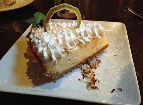 9 August 2013: There’s only one thing wrong with the dessert menu at Blades’ It’s that every single dessert item with which you fall in love doesn’t always grace the menu. Desserts, as with entrees and appetizers, rotate with seasonal regularity. Perhaps the most perfect of summer sweets is Key Lime Pie, the official state pie of the state of Florida. The key lime pie at Blades is terrific with a pronounced key lime flavor (key lime juice, by the way, is yellow not green the way faux key lime pies are presented) tempered with sweetened condensed milk and egg yolks. Kenney Chesney once sang about the perfect key lime pie, describing it as “not too tart, not too sweet.” That’s the perfect description for the key lime pie at Blades’ Bistro.