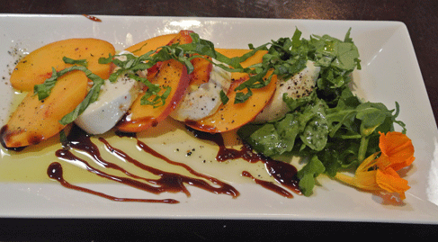 16 August 2013: Before even having a real opportunity to peruse the menu, Anja walked by and whispered two words “Caprese salad.” That was good enough for us. Chef Kevin’s takes some liberties with the traditional Caprese salad. As made in the Isle of Capri, this simple salad is made of sliced fresh mozzarella, tomatoes and basil, seasoned with salt, and olive oil. Blades’ rendition replaces tomatoes with fresh, sliced peaches and adds mint, an edible flower and a drizzle of Balsamic vinegar to the plate. Vive la difference! This is one lively salad with invigorating greens complementing the fresh, sweet-tangy peaches. The creamy mozzarella is the perfect foil, tempering all the bold flavors with its subtle qualities.