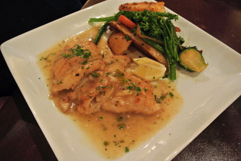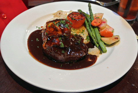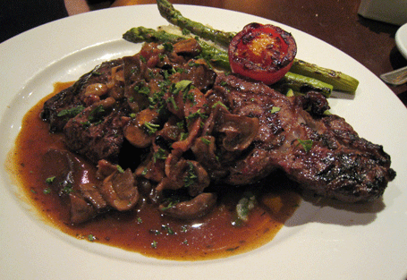 23 February 2012: Another entree any carnivorous landlubber will lust after is a ten- to twelve-ounce rib eye steak which can be prepared with either a green chile or a crimini mushroom demiglace. The steak is prepared to your exacting specifications and arrives at your table surrounded by a rich, glossy pool of pure deliciousness. Unadorned it’s an excellent steak. The crimini mushroom demiglace with its discernible red wine influence elevates it to another level. Served with asparagus spears and one grilled tomato, it’s a terrific entree.